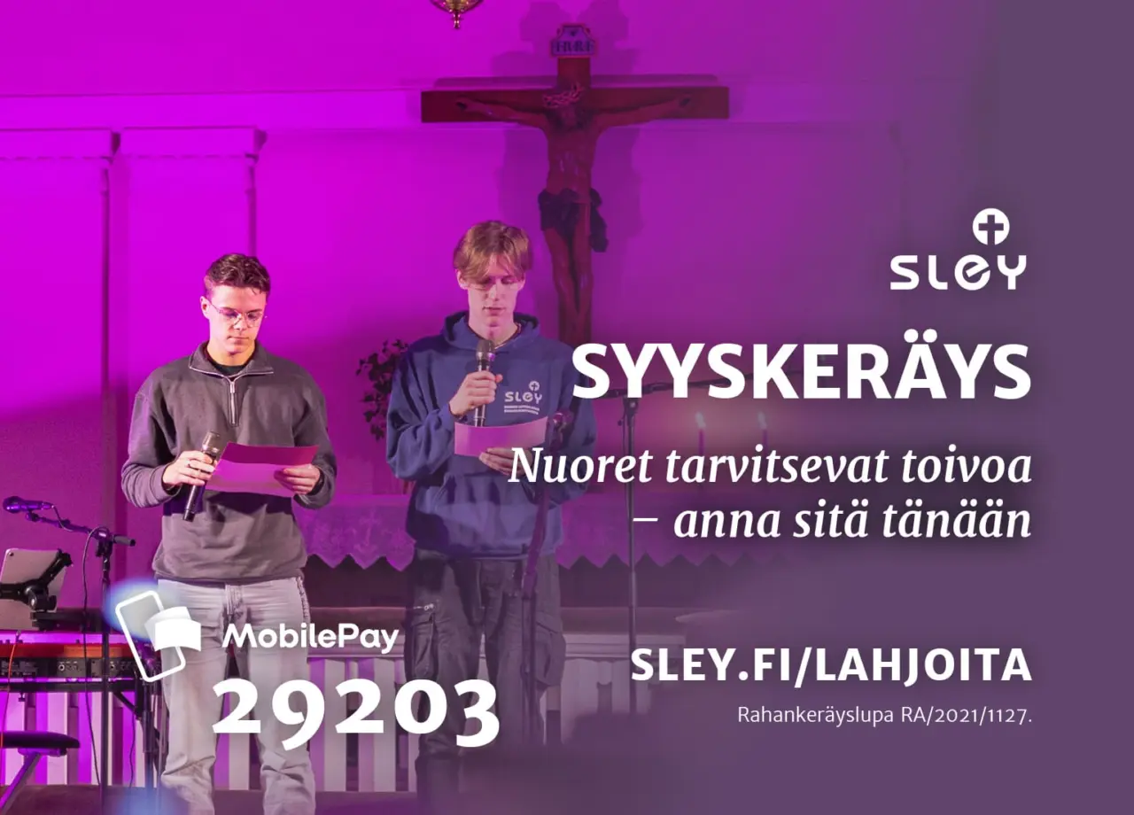 "Nuorten arkea värittää turvattomuus, jossa suursodan uhka yhdistyy suorituspaineisiin, yksinäisyyteen ja ulkopuolisuuden kokemuksiin. Lahjasi Sleyn nuorisotyölle antaa toivoa, turvaa ja rakkautta."